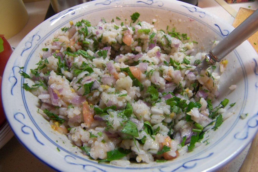 Ten pat sudedame supjaustytą iškabtuotą pomidoro vidų, vieną svogūną, skiltelę česnako, smulkintų petražolių, krapų, druskos ir pipirų (rekomenduotina šviežiai tika su malūnėliu sumaltu). Druskos ir pipirų nepamažiname, kad jaustusi skonis. Viską išmaišome ir galime kimšti į pomidorus ir paprikas. Įdaras turėtų atrodyti maždaug taip: